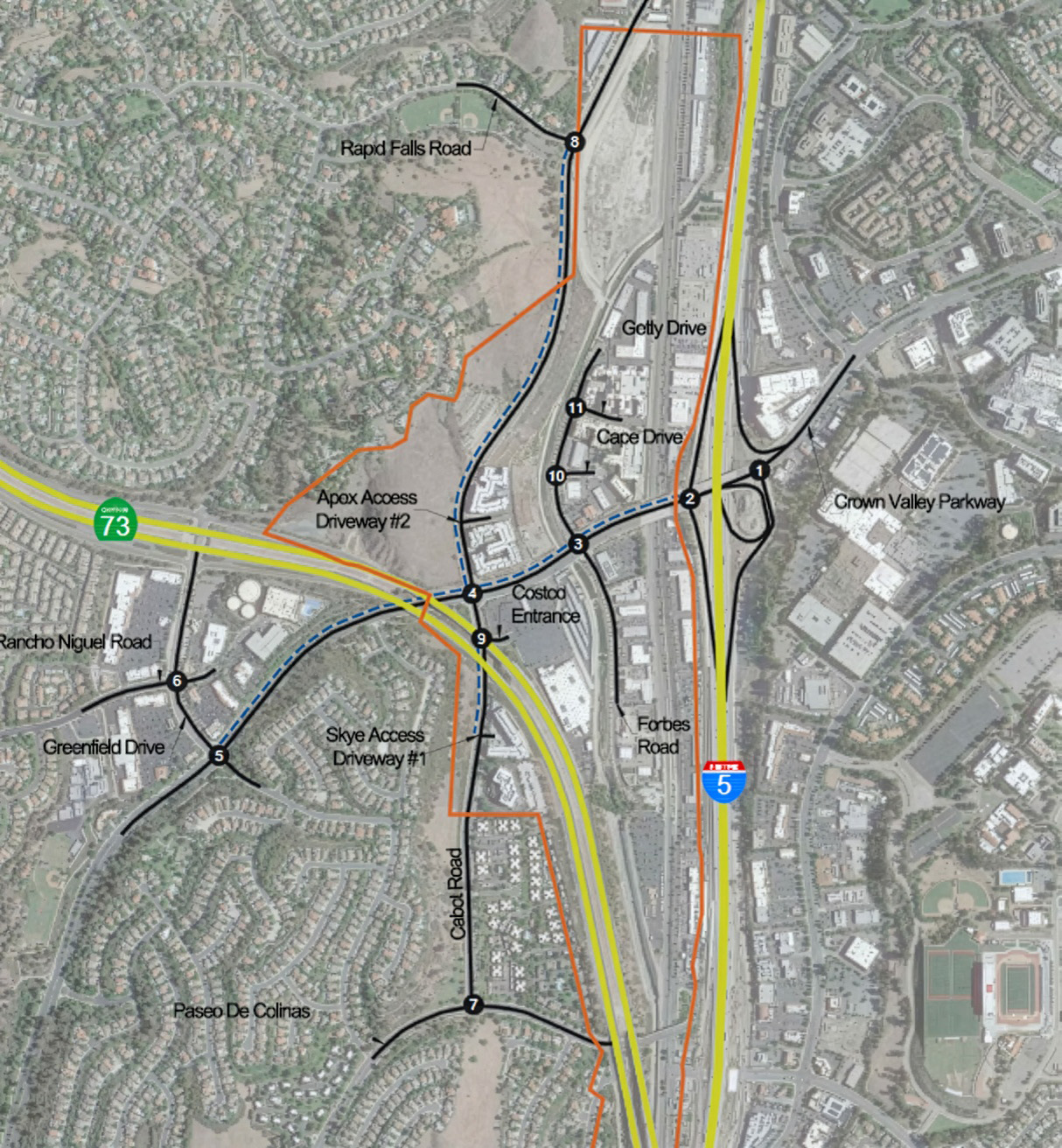 For the Gateway Specific Plan in Laguna Niguel, located along the Crown Valley Parkway and Cabot/Forbes Road corridor, TJW worked with the City to evaluate future land use and circulation scenarios using TransCAD and traffic simulation software (PTV Vistro and Synchro). The Specific Plan allows for a mix of residential, commercial, office, hospitality, and entertainment uses, with intensities that include several thousand residential units and more than two million square feet of non-residential development. TJW analyzed how different development intensities and land use combinations would influence traffic patterns, intersection operations, and overall circulation within the planning area. The analysis provided a clear roadmap for understanding future mobility needs and the operational effects of various buildout scenarios.